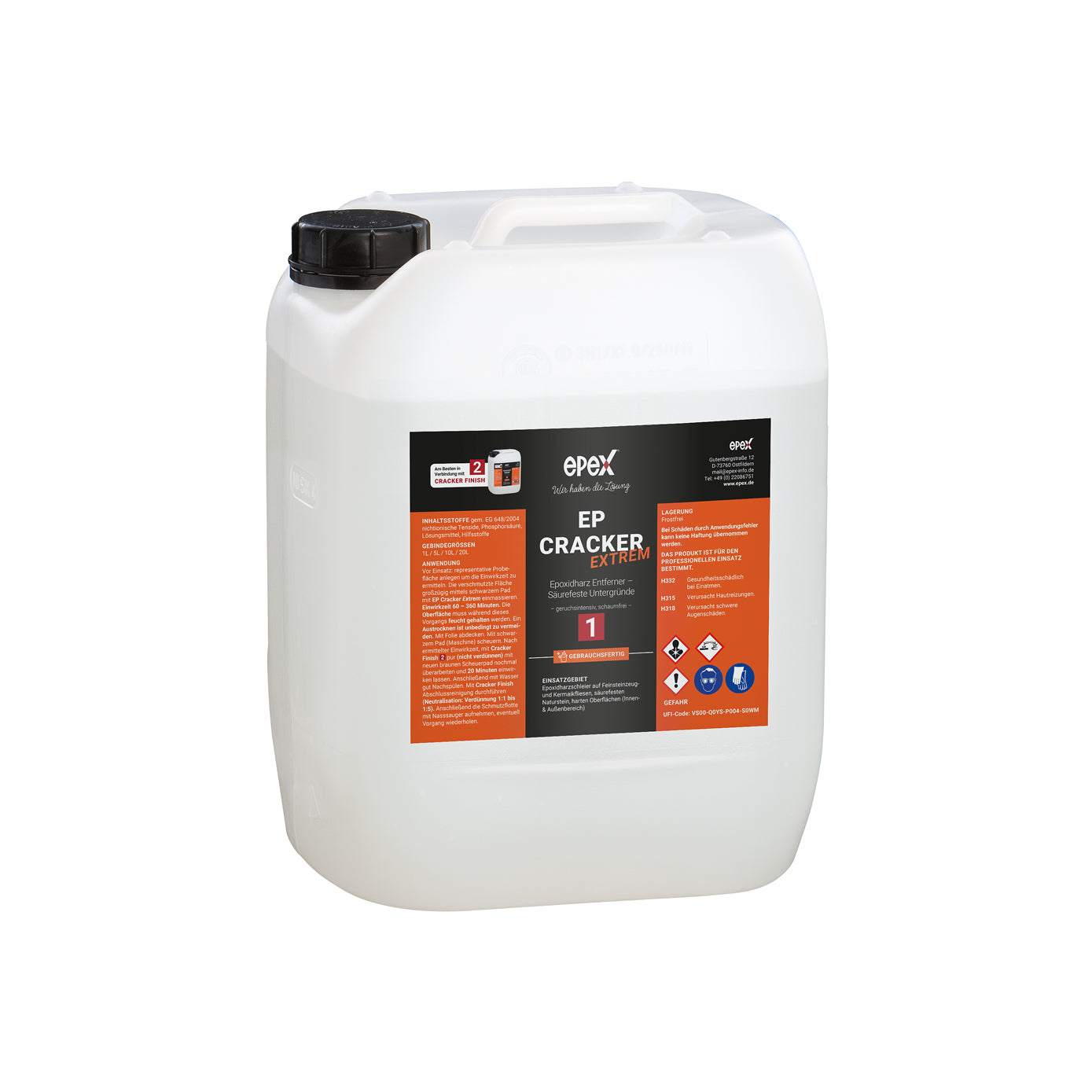 Vor Einsatz: Eine repräsentative Probefläche anlegen, um die Einwirkzeit zu ermitteln. Die verschmutzte Fläche großzügig mittels schwarzem Pad mit EP Cracker Extrem einmassieren. Einwirkzeit: 60–360 Minuten. Die Oberfläche muss während dieses Vorgangs feucht gehalten werden. Ein Austrocknen ist unbedingt zu vermeiden. Gegebenenfalls mit Folie abdecken. Mit schwarzem Pad (Maschine) scheuern. Nach der ermittelten Einwirkzeit mit Cracker Finish (1:3 mit Wasser mischen) und einem neuen schwarzen Pad nochmals überarbeiten und 20 Minuten einwirken lassen. Anschließend mit Wasser gut nachspülen. Mit Cracker Finish eine Abschlussreinigung durchführen (Neutralisation: Verdünnung 1:1 bis 1:5). Danach die Schmutzflotte mit einem Nasssauger aufnehmen, gegebenenfalls den Vorgang wiederholen.