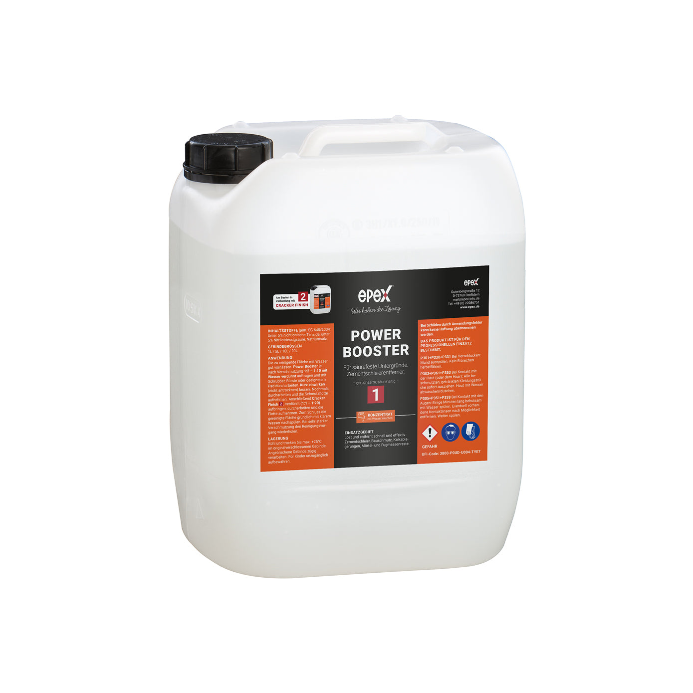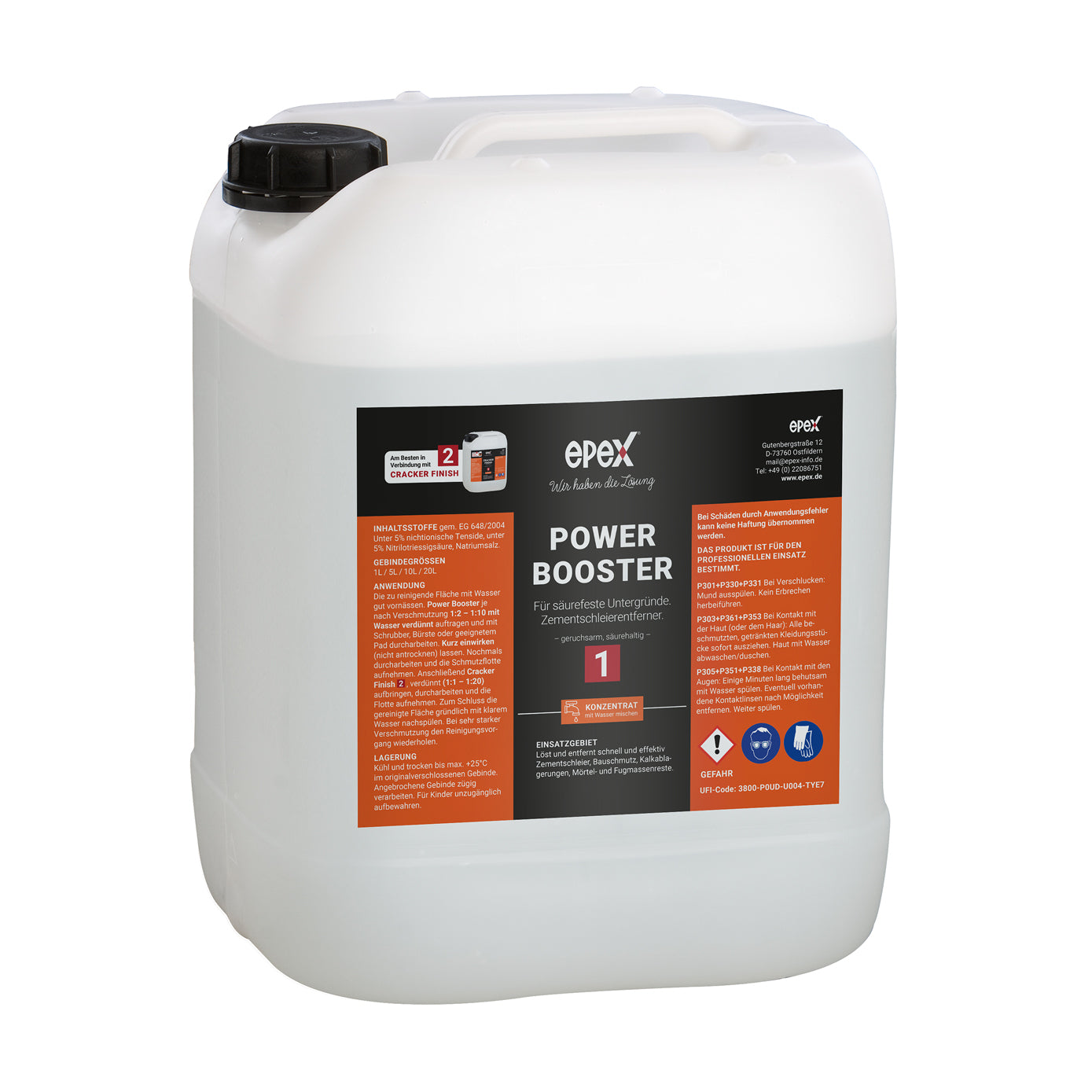 Die zu reinigende Fläche mit Wasser gut vornässen. Den Power Booster je nach Verschmutzung 1:2–1:10 mit Wasser verdünnt auftragen und mit Schrubber, Bürste oder einem geeigneten Pad durcharbeiten. Kurz einwirken lassen (nicht antrocknen lassen). Anschließend nochmals durcharbeiten und die Schmutzflotte aufnehmen. Danach das Cracker Finish, verdünnt (1:1–1:20), aufbringen, durcharbeiten und die Schmutzflotte aufnehmen. Zum Schluss die gereinigte Fläche gründlich mit klarem Wasser nachspülen. Bei sehr starker Verschmutzung den Reinigungsvorgang wiederholen.
